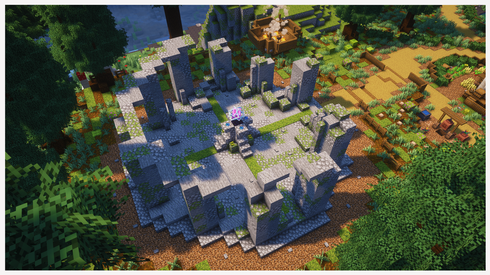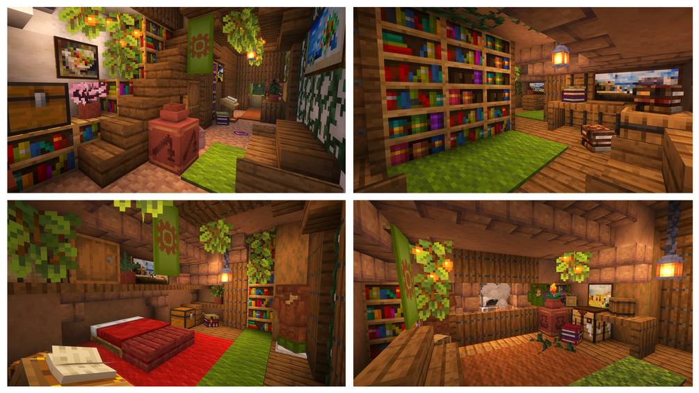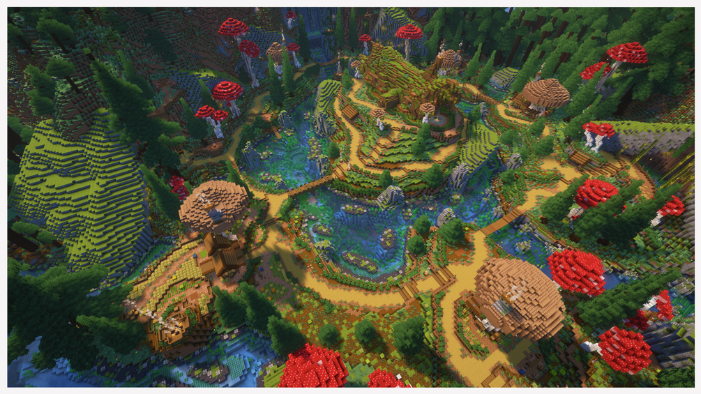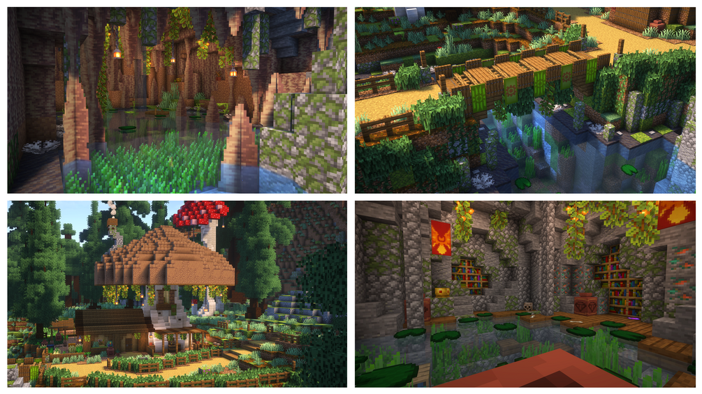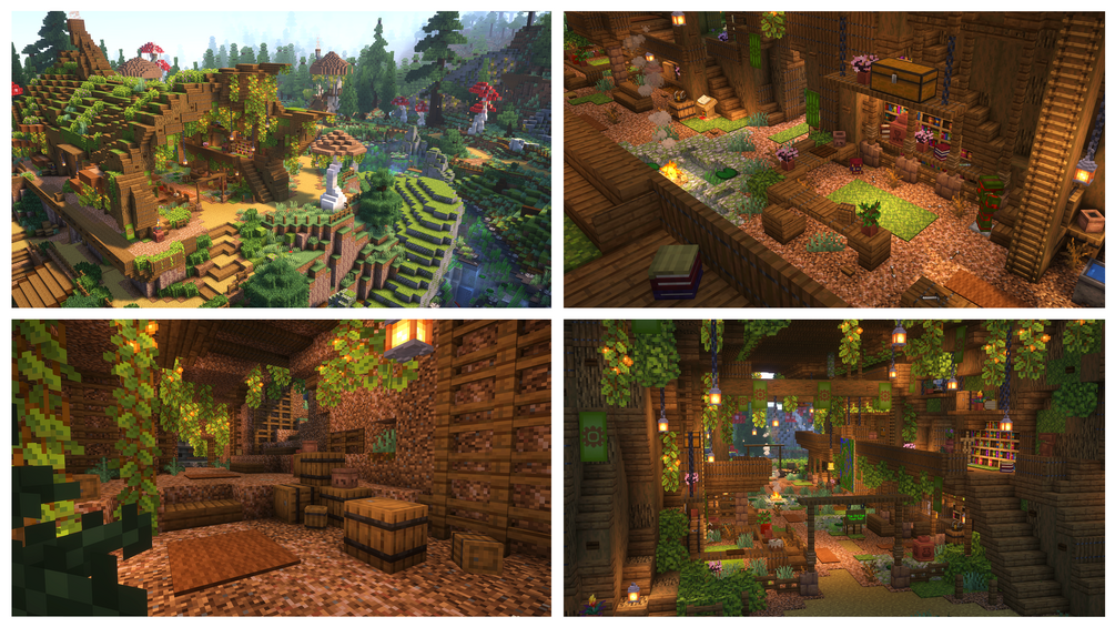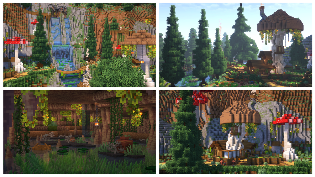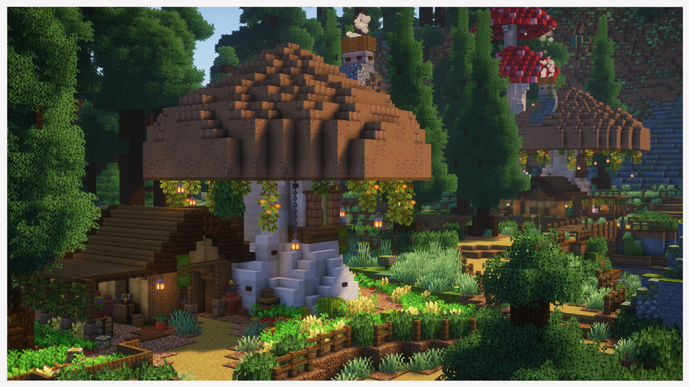 Discover a world of fantasy featuring the transformation of a giant hollow log into a magnificent town centre. Explore a beautiful, sprawling mushroom village nestled within a valley, surrounded by towering pine trees. With meticulously crafted interiors, custom items, hidden secrets, and places to explore, adventure awaits!